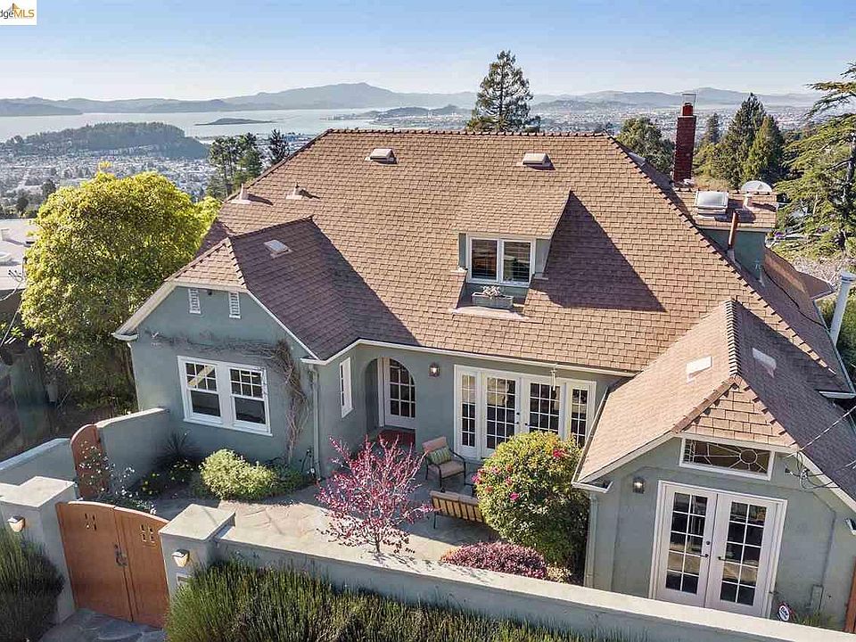 Fabulous Bay views from this lovely updated traditional home surrounded by romantic gardens & mature trees. Access the sunny home via private enclosed landscaped patio with slate flagstones & outside entertaining area. Level-in entrance leads to formal din rm with French doors that open to outdoors. Dramatic vaulted living room with fireplace & Bay windows overlooking SF & the Bay. Remodeled kitchen, media room & two addl. bedrooms on entry level floor. Upstairs, a luxurious master suite with walk-in closet & master bathroom spa has panoramic views from private balcony. Lower level w separate entrance, multi-purpose room, addl. bedroom & full bath - ideal for in-law quarters. Large terraced fenced backyard with level lawn area, patio, Jacuzzi tub & a children's play structure. Single car garage with interior access. Set on a quiet tree-lined street in the heart of the North Berkeley Hills close to parks, UC Berkeley and the SF commute.