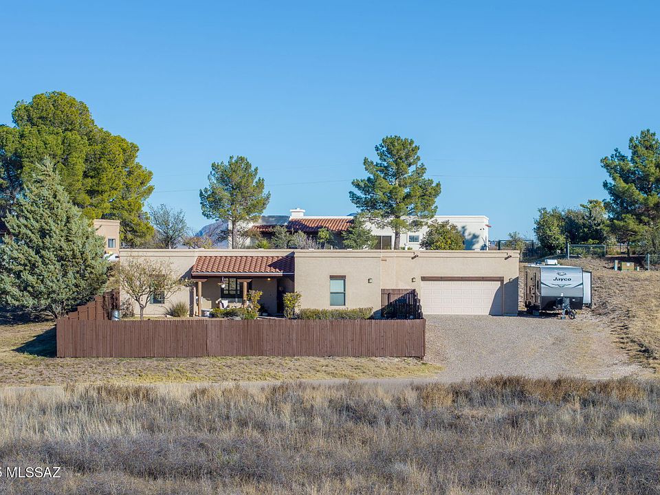 This Sonoita gem won't last long! Great open floor plan with 3 bedrooms, 2 bathrooms. One of the bedrooms is currently being used as a den/TV room. Great Room with great kitchen and lots of storage. 2 car garage with heavy shelving already in place. Covered back porch is shady and out of the wind -- perfect for a family barbeque. Front yard is completely enclosed to provide privacy and a secure area for family and pets. Water is supplied by the HOA. Great location, with lovely views of the Santa Rita Mountains, and not far from the Sonoita Crossroads.Clean, affordable and ready to go! See documents for additional information.