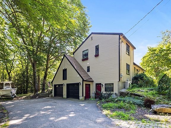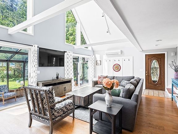 Welcome home to this contemporary style property surrounded by beautiful landscaping, acres of woods, and gorgeous in ground pool. Situated on a private double lot, this home features an open floor plan loaded with windows and natural light. First floor features kitchen with large eating area, dining room and 2 story living room with hardwood floors, gas fireplace, and double sliders to front to back sunroom. Bedroom, bath with walk in shower, and separate laundry with storage room complete the area. Walk up the stairs to the 2 large bedrooms with hardwood floors, full bath with double sinks, and open to below alcove area perfect for desk or sitting area. Walk out lower level features a bedroom, an additional room perfect for home office or recreation room, 2 car garage, and storage space. Showings start Saturday August 27 at 2 pm. Open House Sunday August 28 from 11 to 1.