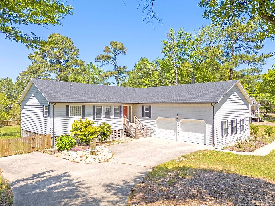 Don't Wait! Here is the single level living you have been waiting for in Southern Shores! Enjoy this 3 bed, 2 bath Pondfront Rancher nestled shortly off of S Dogwood Trl. Large primary ensuite, spacious living area with plenty of natural light looking over Ginguite Pond, bonus space for office/den/playroom, open kitchen and dining with granite counter tops, BIG two car garage with access to outdoor shower. Kick back and let the kids or pups play in the wide-open, fenced-in yard with entry points to sitting by the pond or accessing side steps. Walk along the pebble path and smell the knockout roses. New FORTIFIED roof installed in 2022. Voluntary Southern Shores Civic Association offers both sound and beach access, as well as unlocking the joys of the community's parks and playgrounds. Walking distance to Kitty Hawk Elementary, or head the other way to catch sunsets over Ginguite Creek. Minutes from Duck Woods Country Club, shopping, dining, and immediate access to the Wright Memorial Bridge. Don't let this one slip away!
