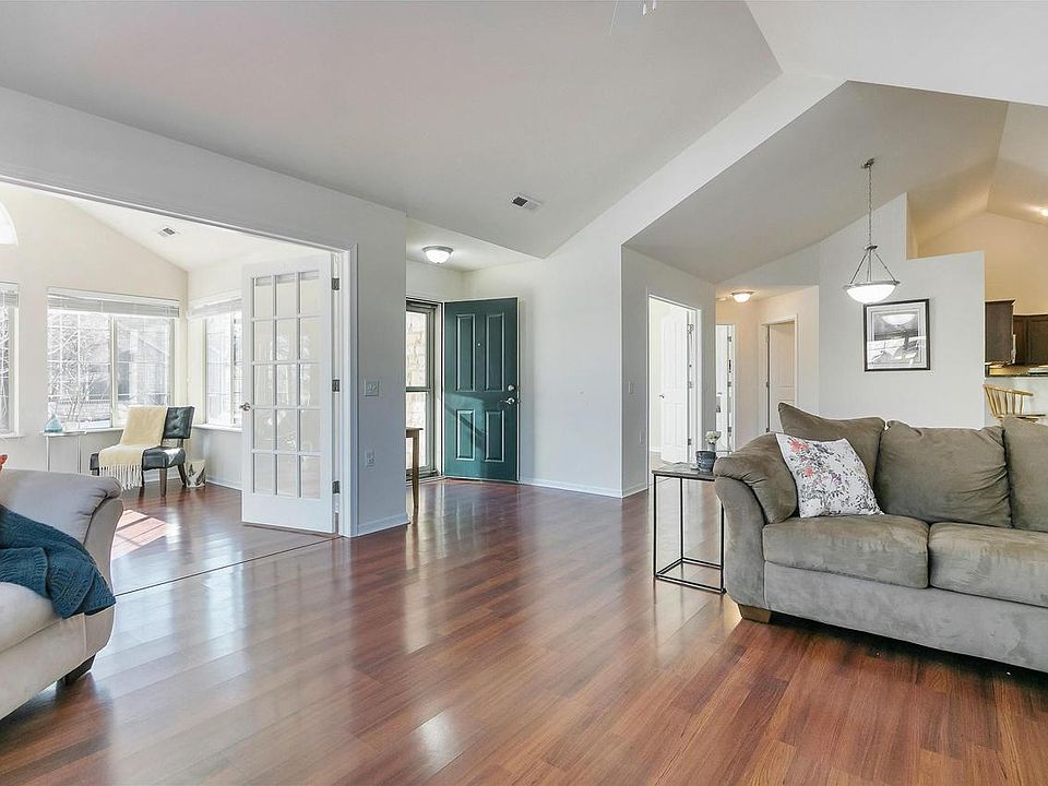 Live the easy life! One level living awaits in this thoughtfully designed custom home. Vaulted ceilings & arched windows are showstoppers. Wood look floors are ez maintenance, flowing through grand open concept ideal for entertaining. Keep cozy w/ a gas fireplace & never worry about shoveling again! A chef's kitchen boasts granite counters, breakfast bar, SS appliances, cherry stain cabinetry, custom rollouts & HUGE pantry. Ensuite w/ dbl sinks, walk in shower, WIC. Bathe in natural light in 4 season room or sweet front patio. Main lvl laundry & mudroom. Assoc has ALL the amenities-pool, clubhouse, fitness rm. Endless storage of numerous closets & attic in oversized garage. Peaceful surrounds of nature & McGraw park w/ walking trails, pond & covered bridge. Yet close to it all. Rare Find!