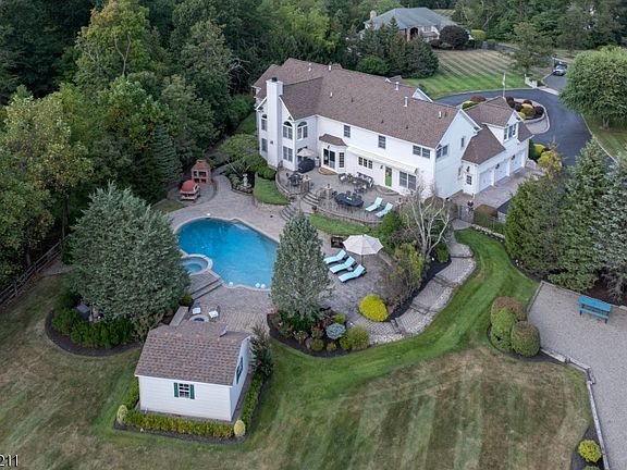 This exceptional Basking Ridge residence offers spacious living and effortless entertaining, both indoors and out. Set at the end of a quiet cul-de-sac amongst beautiful landscaping, privacy is your luxury. This 5 bedroom home invites refined living in one of the areas most desirable locations. Its sun-drenched interior is spacious and thoughtfully designed, with well-appointed rooms and a gracious flow. At the heart of the home is a stunning kitchen with room to host events, and top-of-the-line appliances. The ample kitchen leads to a two tiered patio, with pool house, outdoor fireplace and a large pool for easy indoor/outdoor entertaining. Also on the first floor is the potential for a bedroom or office with a full bath. On the second floor, an expansive primary suite includes a sitting area with a cozy gas fireplace, two roomy walk-in closets and a spa-like bath with a soaking tub and ample natural light. Three additional bedrooms and a spacious exercise room off of the primary complete the floor. The newly renovated finished walk out basement will take your breath away, and provides additional living spaces with an oversized recreation room, bar, potential bedroom and a full bath. Situated just minutes from downtown shops, restaurants and Midtown Direct trains, this distinctive residence perfectly balances peaceful country living and convenience to schools, shopping, parks, world class golf and equestrian.