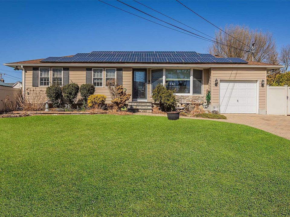 Welcome to 35 Priscilla Ave, nestled in the highly sought-after HHH school district! This beautiful ranch home boasts exceptional curb appeal with its vinyl siding, stone accents, and inviting paver driveway. Step inside to discover an open floor plan with hardwood floors, recessed lighting, and crown molding. The renovated eat-in kitchen is a chef's dream, featuring white shaker cabinets, beautiful tile backsplash, SS appliances, and gas cooking. Entertain guests in the formal dining room and living room, complete with a charming bay window. Retreat to the primary en-suite, which includes a spacious walk-in closet for added convenience. Two additional bedrooms and a full bath provide round out the first floor. The full finished basement offers additional living space, storage, and potential for a home office. Step outside to the incredible yard oasis, perfect for entertaining. With pavers for low maintenance, an inviting in-ground pool, outdoor kitchen setup, beautiful new Trex deck, and a spacious gazebo, this backyard is sure to impress. Additional features include IGS, CAC, gas heat, a separate HWH, precast cesspool (tank and 2 pools), and solar panels for reduced electricity cost! Taxes under $11k. Don't miss out on the opportunity to make 35 Priscilla Ave your new home sweet home., Additional information: Appearance:Mint+++,Separate Hotwater Heater:Yes