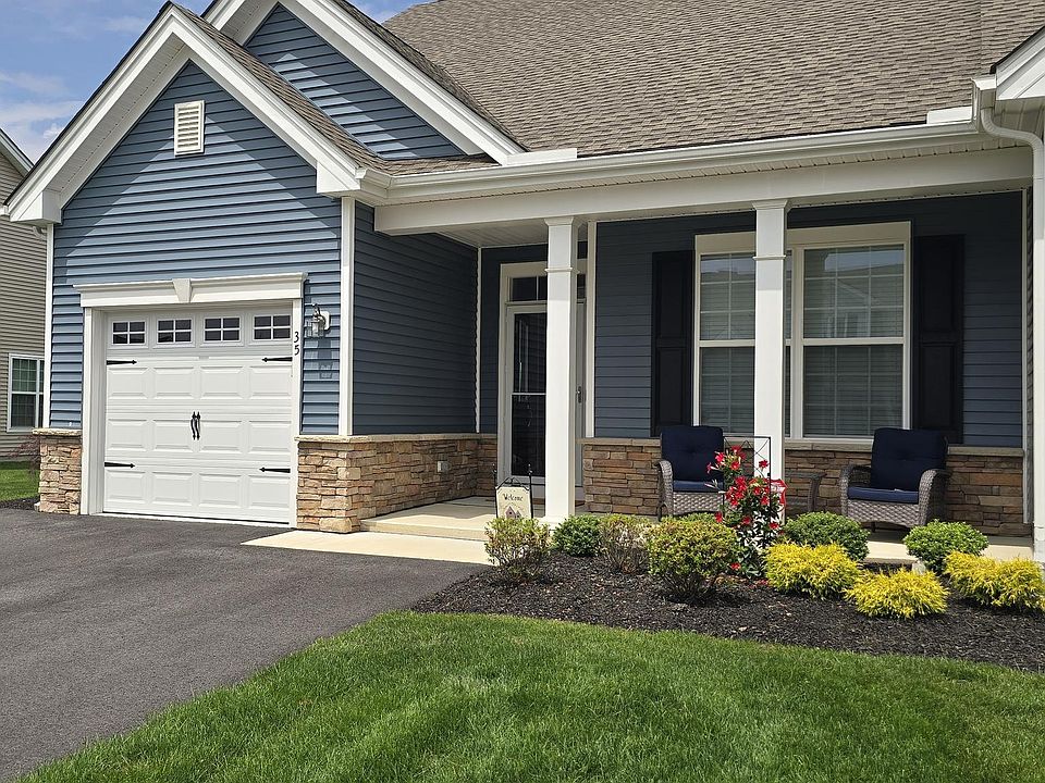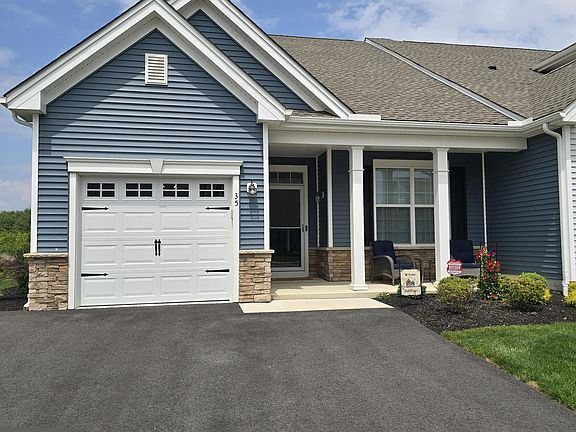 Curb appeal is only the beginning to what you are going to see when you pull up to this 1.5 year new “Over 55 Adult Community” stone front ranch townhome. Immediate possession can be had on this over 2000 square foot Energy Star home. This true 3 bedroom 3 bath is a beautifully decorated home loaded with builder options and homeowner adds (Make sure your Realtor shows you the Detailed List). Also in the Documents Section). Walking through the front door your eyes will be caught by all the natural lighting covering the OPEN floorplan from the mass number of windows. A few steps in your eyes will open wider to the exquisite kitchen. Picture yourself sitting at the waterfall island having your breakfast while admiring the 42-inch cabinetry, very much upgraded Stainless Appliances, stunning Quartz counter tops and tiled backsplash. The cabinets have pull out shelves along with over and under lighting. Where should we go next? How about the living area where you should picture your family members sitting in the living room & sunroom watching TV and/or having great conversations. Maybe some will go out to the 10’ X 16” paver patio and converse outside. These areas are decorated with nice painted walls, window treatments, beautiful LVT flooring, crown moldings, ceiling fan and 5 1/4 inch baseboards. Time to retreat for the night? Step into the very roomy primary bedroom. Again, well-lit with a ceiling fan and a large primary walk-in closet with customized shelving. A tiled bath awaits you with dual sinks for your convenience. Back out to the front of the house and you find another large bedroom for your guest situated right next to another full bathroom. Let’s sneak upstairs. WOW, here is basically a private suite for your guest. From the very large 3rd bedroom, great private bath and a sitting area to relax by themselves. Now, do you work from home? Great, there is the quiet comfortable office area where you can get all your work down in peace and quiet. Behind the office is a climate-controlled storage room. We do not think any homes here have this additional area to it. Wait!!! The garage!! These owners like everything in neat order. Custom, above the garage door shelves along with Gladiator shelving and cabinets. Garage walls are nicely finished with gloss White paint and professional Epoxy floor. It is so clean you hate to drive your car in. Finished off with a convenient garage door opener. Outside, the sellers added a side garden with nice plants to shade the A/C units. ****Immediate move-in is possible.****The sellers know that you have to wait for months to get into a new home. Don’t wait, you move into this one in weeks. With all the options you see on your visit, you will see why you win with this one over waiting for the new one to be built. Move in soon enough and you can use all the great amenities of the fabulous Clubhouse. Pool table, exercise room, kitchenette and conversation seating area by the TV. Outside, find the heated pool, Pickleball court and fenced dog run. Location of this home is so close to shopping, resturants and movie theaters.