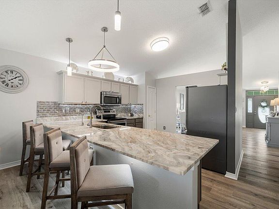 Step inside to discover an open floor plan that flows effortlessly from room to room. The front room is adjacent to the dining space and offers a separate living space from the spacious main living area. Perfect for family gatherings, the updated kitchen is open to the main living area and the dining room, it is a true chef's delight with its sleek finishes and ample storage. The oversized peninsula-shaped granite countertops offer more seating that flows seamlessly into the living area.