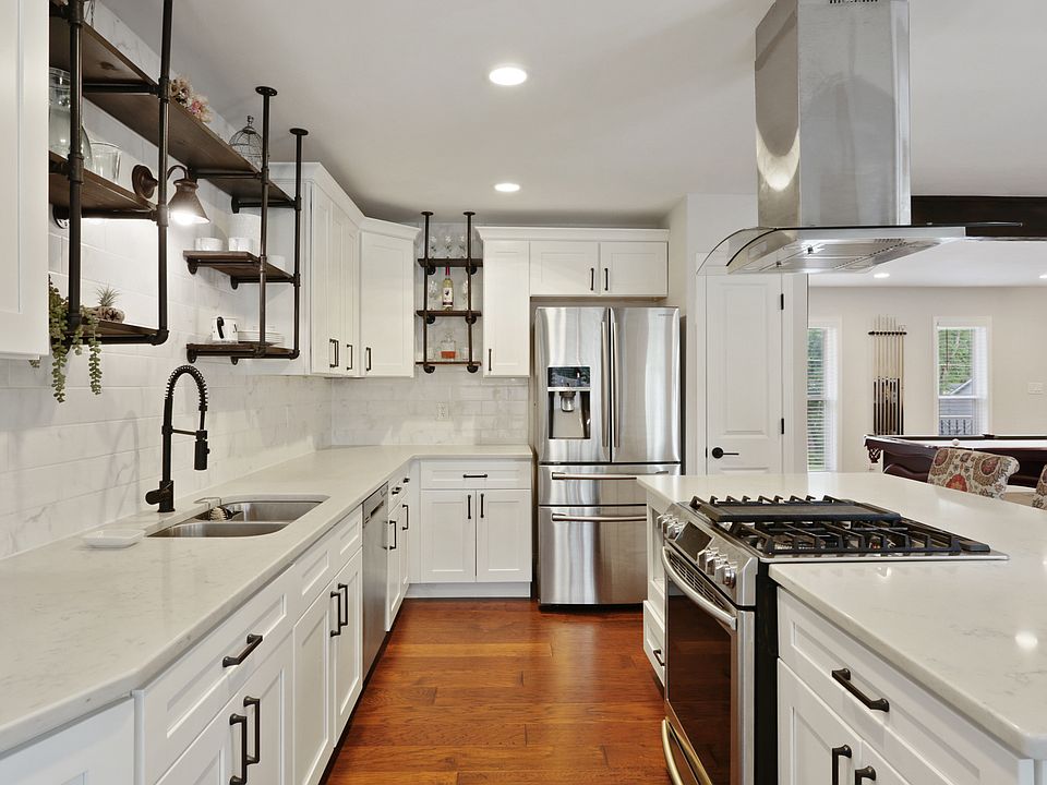 - Kitchen Features: Breakfast Bar, View to Family Room, Stone Counters, Kitchen Island, Cabinets White