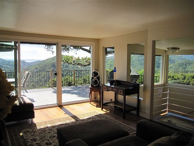 Sexy hilltop hideaway above the madding crowd, yet only minutes away. Come home to spectacular views of Mount Tamalpais, the Bay, Mount Diablo and sloping green valleys. This home is a place where you can truly turn off your mind and experience peace and privacy. Enjoy the indoor/outdoor living with FLAT YARD at the upper level entry and a VERY LARGE FLAT YARD off of the lower level of the home. Unique to have the ridge top views AND the large level yards. This home also offers charming period details, lots of natural light year round, hardwood floors, wood burning fireplace, newer roof and decks and much more. The kitchen features a side-by-side refrigerator/freezer with automatic ice maker and cold water dispenser, gas stove and oven, microwave, dishwasher and garbage disposal. Both bedrooms are en suite, with their own full, private, remodeled baths. This home is located on a coveted street, where homes rarely become available because once you get here you won t want to leave.