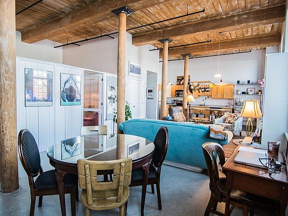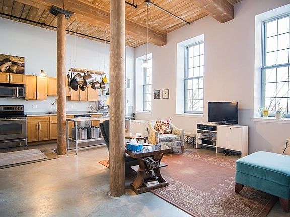 Desirable Renaissance on the River loft style condo on the 2nd floor with scenic views of the Merrimack River and the Aiken Bridge. Well maintained open-concept living/dining area with 12 ft. ceilings and five oversized 9 ft. windows accented by exposed beams, fantastic wooden pillars and concrete flooring. Beautifully custom built floating walls and closets allow for a fantastic separate and cozy bedroom space. A gorgeous and open kitchen boasts plenty of counter space with maple cabinets and stainless steel appliances. W/D in unit included. Condo fee includes heat/AC, water, hot water, snow removal, maintenance and deeded parking. On site condo amenities include storage unit, bicycle storage, game room, fitness room, and outdoor park/riverwalk to enjoy. Just a short walk to parks, downtown restaurants, thriving arts community, and Tsongas Center. Minutes to Route 3, 93, 495 and Lowell Connector.