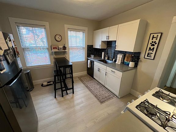 Available on December 1st! Sunny & charming two bedroom apartment with hardwood floors, renovated K&B. Living room open to the dining room with built in cabinet. Not a typical floor plan as the second room, often used as a bedroom is at the rear of the house, through the back hallway. Two nice size bedrooms, bathroom has walk in shower, no tub. Private front porch(as pictured), one parking space included in the driveway. Shared laundry with 3rd floor tenant in the basement. Apartment is heated by gas(paid by tenant). No smoking! Tenant is responsible for utilities. Gas heating system.