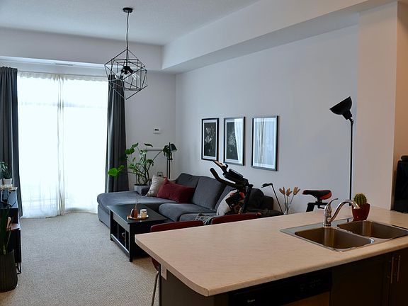 Bright and beautiful 1 Bedroom + Den (699+ sq. ft.) with 10' ceilings and balcony in Stoney Creek lakefront community. Steps away from the beach and Confederation Park's waterfront trail! Easy access to highway for convenient commuting. Unit features walk-in closet, in-suite laundry, + underground parking and locker. All ELFs, window coverings, and S/S appliances (fridge, stove, dishwasher, microwave) included. Building features include roof top terrace, bike storage, exercise room, party room, and visitor parking. Quiet building (including no upstairs neighbours)! Tenant pays hydro + internet. Note: building features eco-friendly geothermal heating/cooling that averages only $60 monthly. No smoking. Pets permitted.