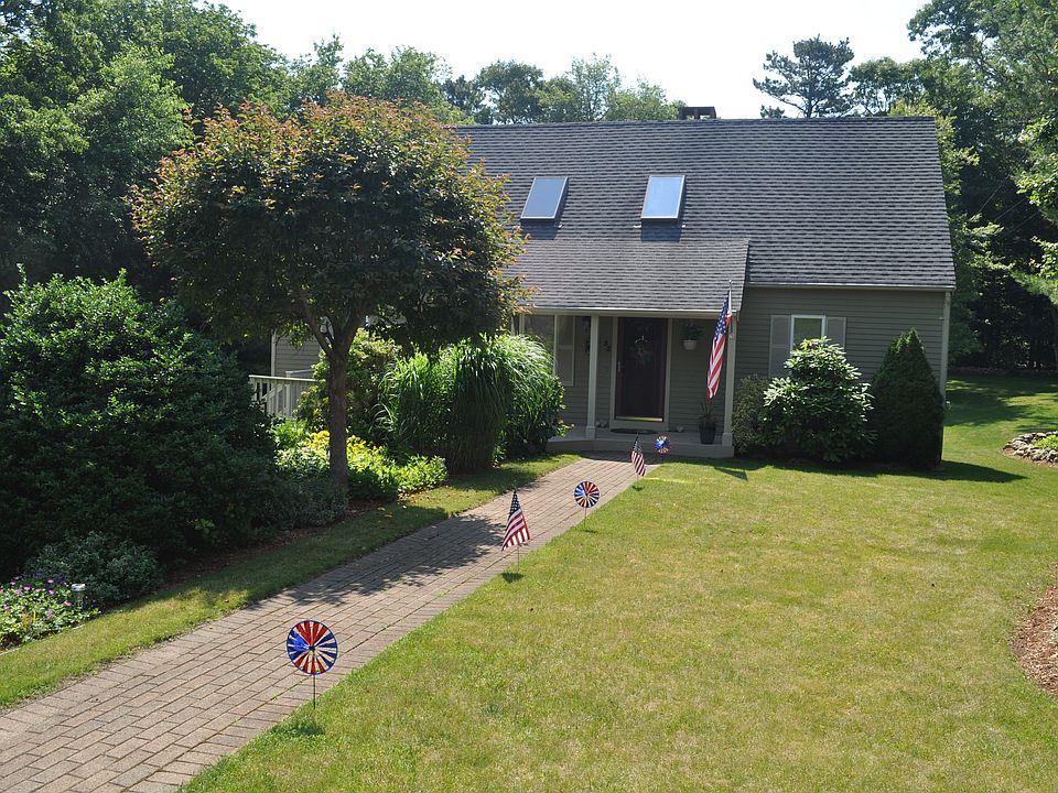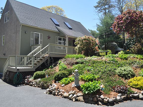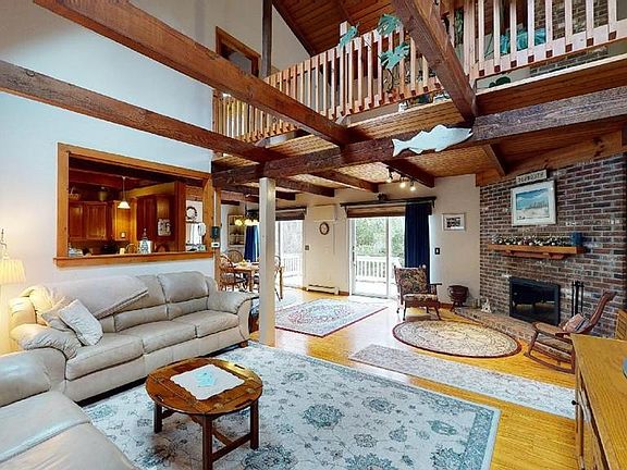 Multiple offers, 5pm 2/23 deadline. Enjoy this private beach community, a quick 10-minute walk to a quiet sandy beach with deeded rights and access. This rustic, yet coastal, contemporary cape design offers a cozy open-floorplan with wood floors and ceilings. Enter from the front porch into a cathedral family room with beams, skylights and a large loft. The room hosts a fireplace and sliders to a large back deck; it flows to the kitchen with granite counters and a dining area. The first-floor master has sliders to the deck and a full bathroom. Upstairs are two bedrooms with high ceilings on opposite sides of the large loft with a bathroom. Enjoy the professional landscaping and your own trail entrance from the backyard. A two-car garage also fits kayaks and a work area, or maybe your own golf cart. The unfinished basement with washer and dryer gives room to expand, the shed and 2nd-floor eaves provide even more storage. Minutes to Route 3, Cape Cod Canal, Sagamore Beach and more.