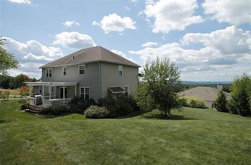Enjoy magnificent views from the front porch of this tastefully-appointed colonial.This home offers sophistication without ostentation.Whether it is the accommodating pergola off the spacious dine-in kitchen, the decorative crown molding, the enhancing use of wainscoting, or the finished bonus room above the garage,this home's finishing touches foster a refined yet understated appeal.The kitchen offers a breakfast bar,dining area, ample cabinet and counter space,recessed lighting, and solid stone counters.It is open to an informal family room anchored by a stone gas fireplace.The formal dining room is complemented by French doors, wainscoting,ornamental crown molding & a medallion from which the chandelier hangs.French doors lead living room w/ceiling fan.Wainscoting grace the downstairs hallway, the stairway,upstairs hallway,and one the 4 bedrooms. The master bedroom w/walk-in closet and master-bath w/jet tub, shower and dual vanity will impress.The bonus room offers many uses.