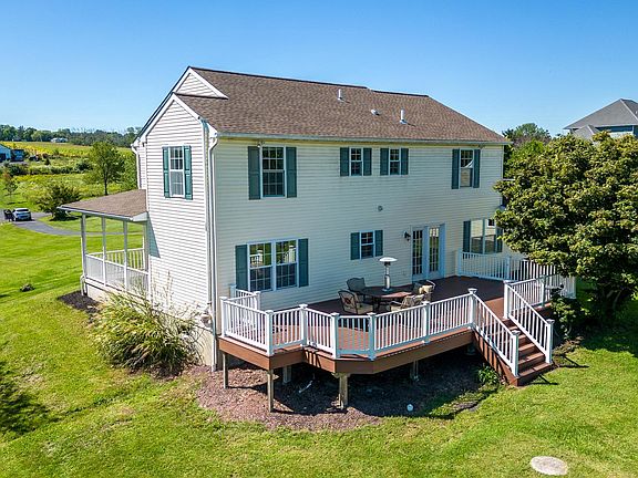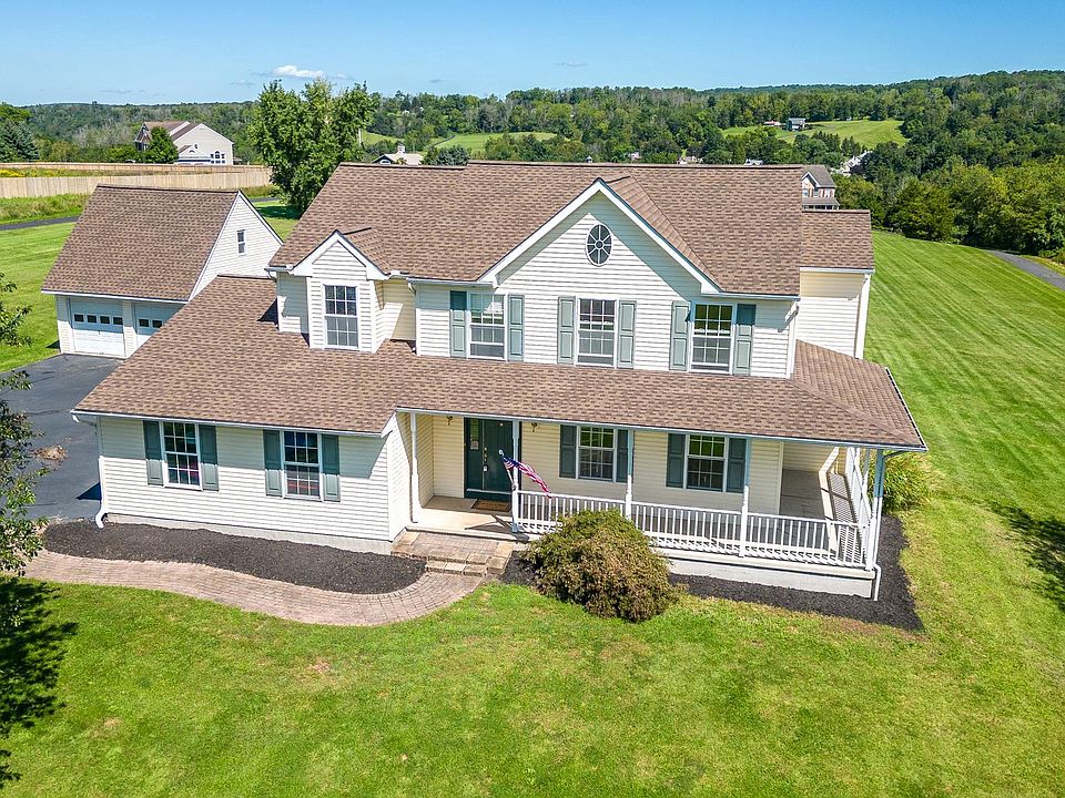 Beautiful Views and Great Location! Perfectly placed on a 3-acre lot with long-distance views is this 4 bedroom, 2.5 bath home with a finished basement and extra 2 car garage. Enter the home from the covered wrap-around front porch perfect for your rocking chairs. There is an office as you enter on the right with new carpet, chair rail and crown molding (could also be used as a living room). French doors lead to the dining room with a window overlooking the picturesque rear yard. The kitchen has a center island, lots of cabinets, breakfast area and a sliding door to the spacious rear deck made from Timbertech decking. The family room has a lovely gas fireplace and recessed lighting. Completing the first floor is a half bath. On the second level, there are 4 bedrooms including the master with a private bath. Rounding out the second floor is a convenient laundry room and full bathroom. The lower level has been mostly finished with a grand great/game room and bar area. There is a separate finished room and a utility room which also allows you to see the spray foam insulation that keeps your heating and cooling bills low. All your outdoor activities can be fully enjoyed on the 2.99-acre open lot that gently slopes to the rear providing great views. There is a two-car attached garage and an additional 2 car detached garage with a walk-up second-floor space perfect for storage or could be finished for a man cave. The roof and HVAC system are new. There is also an invisible dog fence included with the sale. Steeple Dr is a cul-de-sac road off of Church Hill Rd that is very private yet convenient to 611, 412, and 1 minute to Palisades Schools. 10 minutes to NJ, 20 minutes to Doylestown, and close to great recreation areas like Nockamixon State Park, Ringing Rocks, Delaware River and Canal, Lake Warren and so much more!