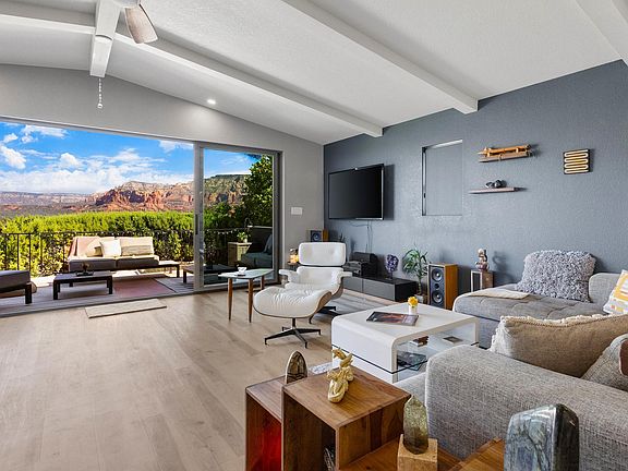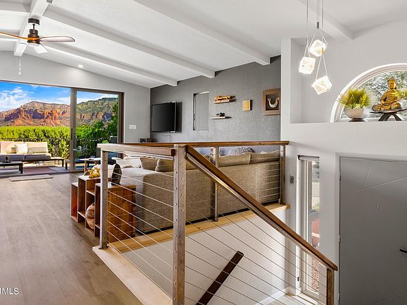 This is why one moves to Sedona! Welcome to 35 Sycamore Canyon in the heart of West Sedona, where the views are panoramic, unparalleled and WILL take your breath away! Two-Story split level, 2464 square foot home has been artfully redesigned, reimagined, and remodeled with chic and modern finishes. Almost every surface has been touched. From the custom Italian front door to the interior cable handrails to the warm high quality vinyl wood flooring, this is a completely turnkey wonder! Upper level is inviting with an open concept floor plan encompassing the living, dining and kitchen area, which are all centered towards a gorgeous deck with wall to ceiling bifold sliding doors that open to the magnificent views of Sedona's famed red rocks. Picture snow on the mountains, dewy sunrises, and magnificent sunset, or just marvel at the stars! U-Shape open kitchen has artistic touches like open shelving and triangulated tile backsplash. Primary bedroom offers an open-aired balcony with jaw-dropping views, floating dual vanities, fully upgraded walk-in shower and a huge walk-in closet that even has a sunset view! Main floor is finished with 2nd bedroom and a remodeled full bath. Downstairs the magic continues with a reimagined laundry room with sink and cabinets, three generously sized bedrooms, offering either red rock or beautiful juniper tree views. One bedroom has direct access to deck and red rock views, one has its own split ¾ bath and a separate entrance - perfect as an office, game room or exercise room. Besides the three bedrooms, lower level is finished with a powder room, and an extended 2 car garage. Generous .28 of an acre offers a private fenced backyard with a modern open/closed roofed pergola with unobstructed views of Thunder Mountain, a paved patio surrounded by fruit trees, and the perfect placement and hookup for a hot tub. Among the extensive list of upgrades includes a fully paved RV pad with full-hook ups, (30 Amp, water, and sewer) that can double as extra parking, freestanding shed, and plenty of room to add a pool. Location is ideal as it's a short stroll to Airport Vista Vortex or the Hwy 89A corridor with shopping and restaurants. And with no HOA, this home could easily be turned into a short-term rental. All the work has been completed at this beauty by the current owners with love and vision. It is now ready to be yours to experience its beautiful energy and red rock views. Current owners will require a longer close or a leaseback until 2/28/25, or a combo of both!