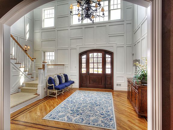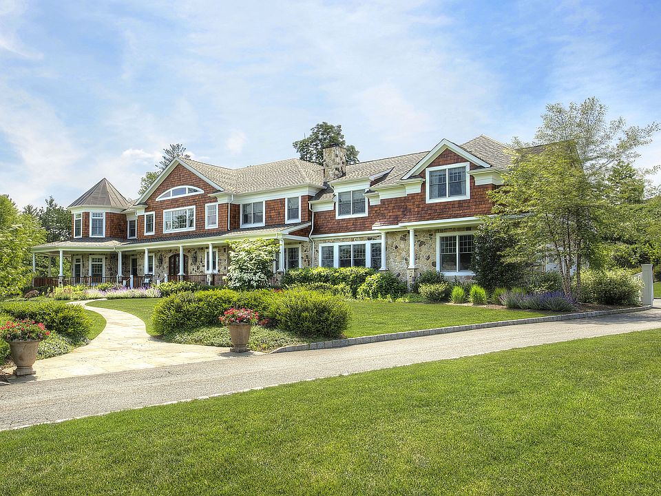 Showcased on a cul de sac of distinctive custom homes, this grand residence draws its inspiration from the 19th century shingle-style manors of Newport. Built in 2009, it is a vision of rusticity and elegance rendered with the finest craftsmanship, materials and technological innovations. Stone and cedar siding, a copper-roofed turret and expansive porches affirm the home’s compelling heritage. Indoors, high ceilings amplify the approximately 8500 square feet of living space. Rich detailing is portrayed with artistically designed coffered ceilings, carved-panel walls, layered molding, gracefully arched passages. Travertine and oak is underfoot and wide oak staircases are supplemented with an all-level elevator. Best in class is apparent in the cherry paneled library prefaced with sitting room and includes one of the home’s five artfully framed fireplaces. The spacious kitchen, designed by Leonardis, sports Downsview cabinetry, an 11.5-foot island, pantry and chef’s grade appliances. At the adjoining breakfast room, sliding-glass doors open to the Adirondack-style stone and cedar porch complete with outdoor kitchen. Nearby the family room soars to twenty feet. Luxury and comfort continue to the second level where the master suite includes a sitting room, large custom closet and marble bath with steam shower, whirlpool tub, men’s room and sunning balcony. Four additional bedrooms, two master-sized, and all with radiant heated baths and generous closets as well as a spacious recreation room share this level. A sixth suite is located in the main level’s service hall. Unfinished spaces include the 10-foot high full basement and walk-up attic. There are also two, 2-car garages each fitted with a GarageTek storage system. Among the mechanicals are a Crestron smart home system, 5-zone heating and cooling, Lutron lighting, two-75-gallon hot water heaters, sophisticated security, interior and exterior sound, lawn and landscape irrigation and Kohler 20kW generator. Summarily heightening this offering’s allure is its engaging pool compound. A stone fireplace and pergola stand at the helm. Waterfalls add dramatic impact to the salt water pool and spa accompanied with fire pit. There are built-in benches, a carved stone chair, cozy cove and slide. Jandy controls lend a hand with the fun. And lush landscaping adds color and texture to this delightful idyll.
