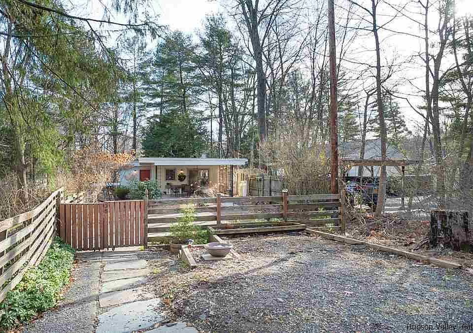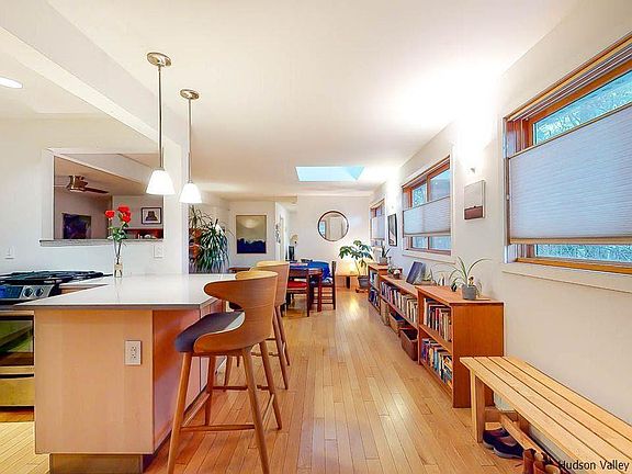 Just in time for the New Year comes this Mid-century modern Woodstock village home, complimented by its lovely, large yard that even touches upon the flowing Tannery Brook stream. In the garden you'll find a place to sit and meditate in pleasant weather near the stream with it's stone steps LEADING To the water. The owner has many perennial flowering plants and scrubs to please the eye and invite the birds to call- early spring comes with a riot of bright yellow forsythia along one sideline. Located in the heart of the village, the house itself is set well back from the street primarily surrounded by its lawn and trees, thus the privacy of living in a village neighborhood is enhanced. Additionally plentiful off street parking and a large front of house patio create an extensive buffer for this low-slung mid-century structure. The current owner basically took the home down to the studs- thus, in practical terms it's a ten year old house. The many windows are placed to let the ever changing Catskill painters light enter the open kitchen, dining and living room areas. The hardwood, polished light oak floors are a dream while additionally adding to the clean and open feeling of this home. Originally there were two bedrooms on the main floor, one has become an office/den. From the upstairs there is direct access to the lower level which hosts a myriad of options. Here discover a terrific second living room, or business/art space complete with mini kitchenette for the easy use of the adult family members or guests. A second large bedroom and remodeled bathroom are close to perfect. This true private living space has direct access out to the large yard and is steps to the meditation bench overlooking the stream. Still more- on this level there is a substantial storage area and laundry washer/dryer. The home provides so many options and is an easy stroll or bike ride to the entire Woodstock town experience.