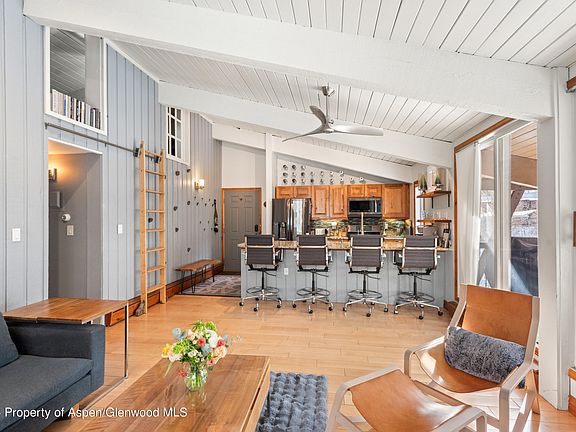 This top-floor Woodbridge Condominium offers a refreshing update and a prime south-facing position, granting breathtaking views of Snowmass Ski area. With two bedrooms, two bathrooms, and a loft featuring two twin beds and a sofa, there's ample space for hosting friends and family. The living spaces are bathed in natural light, courtesy of vaulted ceilings and additional windows overlooking facing west and north that overlook open space. Throughout the condo, you'll find stylish wood flooring adding warmth and elegance. Step out onto the private south-facing deck, accessible through sliding glass doors, perfect for enjoying BBQs and soaking up the sun. The bedrooms boast vaulted ceilings, enhancing the sense of spaciousness and light. The well-appointed kitchen features solid slab granite countertops, stainless steel appliances, a custom tile backsplash, and slate flooring. Both bathrooms offer tub-shower combinations with sleek glass enclosures. A highlight of the living room is the custom ledge stone gas fireplace. For added convenience, there's an in-unit full-size stackable washer/dryer. Parking is hassle-free with common HOA parking right in front of the building, and access to the Snowmass shuttle bus stop is conveniently located just below Building 7. Secure exterior storage is available for skis and snowboards. Residents will soon enjoy the new pool, gym, and spa complex, thanks to the $22,000 special assessment paid in full for completion by Memorial Day 2024. Sold turn-key furnished, this condo offers an effortless lifestyle in the heart of Snowmass Village, with easy access to the Town Center and ski-in/ski-out convenience via Woodbridge from Assay Hill and Elk Camp Gondola.