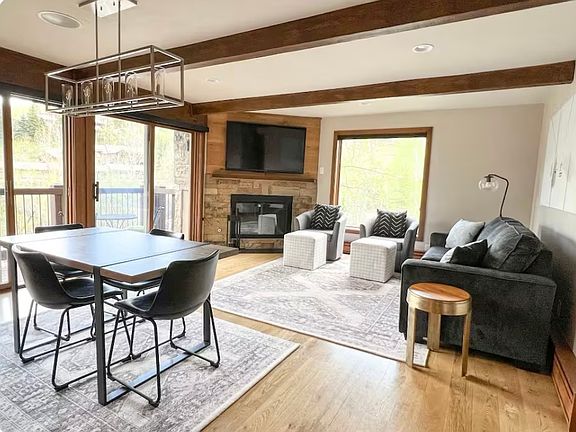 2 bedroom/2 bathroom fully furnished condo. (The condo can be unfurnished as well). Remolded mountain modern Woodbridge condo for rent. The primary bedroom features a queen size bed with an en suite bathroom. The second bedroom features two twin beds that can convert to a king. Brand new pool, sauna hot tub, and gym opened in the Woodbridge community building in July of 2024. Stainless appliances, washer and dryer in unit. All utilities are included in the monthly rent. Steps to the lifts, shuttle, grocery, post office, restaurants, and shopping. Big windows with lots of light and views. Length of lease terms are negotiable. No smoking and no pets. Flexible lease terms. Monthly rent includes all utilities; cable, internet, heat, water, pool, sauna, gym and hot tub. Two parking spaces are included in the rental.