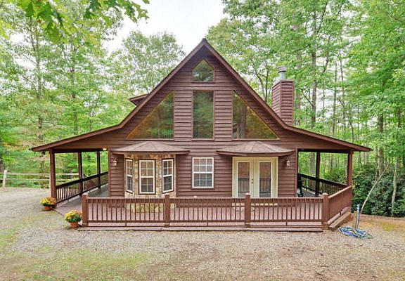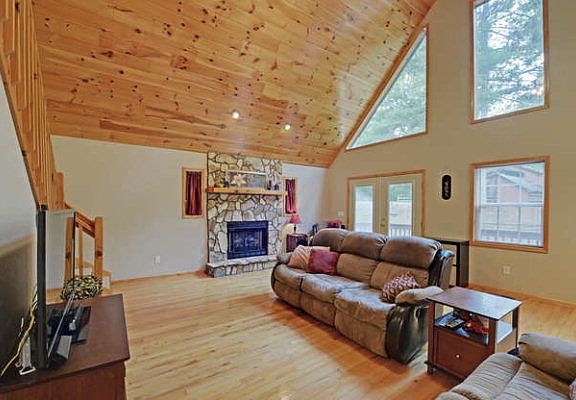 SUPER SIZED CHALET W/ 2 MASTER SUITES!!! Main level master BR opens to a covered porch, double sinks in spacious master bath, roomy kitchen w/ all appliances, washer & dryer remain in the nice size laundry room that also has a pantry. Open great room w/ cathedral wood ceilings, wood floors & a beautiful stone FP w/ gas logs. You will love the upstairs master suite as it has a nook perfect for an office or nursery, a roomy bathroom w/ jacuzzi tub & second private balcony for your enjoyment. Th unfinished basement is plumbed & awaiting your special touches or can be used for that workshop you've always wanted!! Paved road, fresh exterior stain, FIBER OPTIC INTERNET & room for a garage!!!