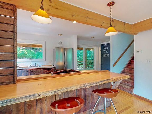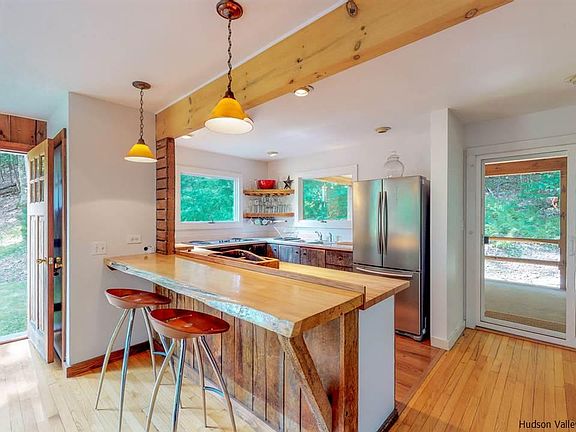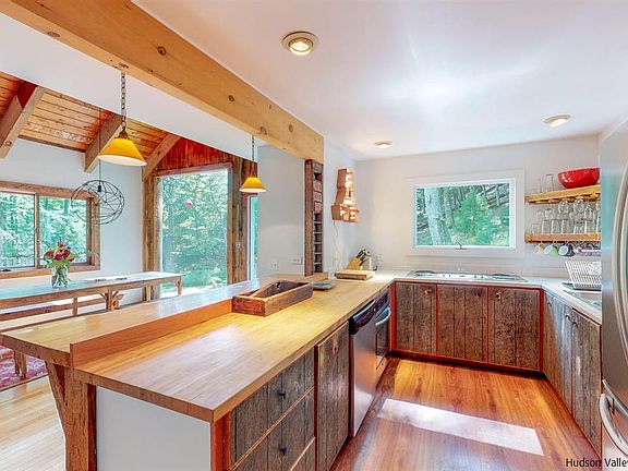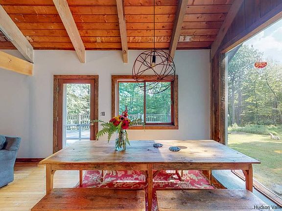 If you're dreaming of escaping to your own private hideaway in the woods this rare and modern two-bedroom could be just the property you've been searching for. Truly one of a kind, this unique home is nestled on 16 secluded acres and is just two hours from New York City. Enveloped by forest and breathtaking surrounds, this is one home you will never want to leave. Depending on the weather outside, you can choose to get cozy in front of the wood-burning stone fireplace and enjoy a good book or bask on the sundeck and admire seasonal mountain views with friends. Set over three levels, there are open-plan living areas to enjoy with large windows that allow natural light to fill the room while also perfectly framing the outlook. Hardwood and wide floorboards run underfoot while cathedral and beamed ceilings add character and charm to this impressive residence. Whether you're preparing a meal for guests or a romantic dinner for two, the open kitchen will make cooking a pleasure. There is a suite of modern appliances along with plenty of counter space, a breakfast bar and direct access to the sunlit dining room or out to the sundeck. There are two full baths and one half-bath with a bathroom on each level for total convenience plus there is a covered back porch on a foundation meaning it could be converted into additional living space, depending on your needs. Ensuring there's plenty of space to spread out and relax, there's a family room on the lower level which could be used as a workout room and there's plenty of space on the property to add a garage or studio. The laundry room is on the main level and there's also radiant heating and a metal roof. This idyllic home is the epitome of peaceful living, located at the end of a long driveway off a private road. Cooper Lake and Wilson State Park are both only minutes away and are renowned for quality fishing and hiking along with canoe and kayak rental, perfect for those who love the outdoors. The center of Woodstock is less than a 15-minute drive away and is home to a huge range of shops, restaurants, music venues, and amenities.