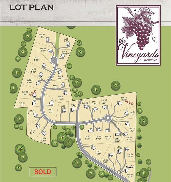 Welcome to The Vineyards, exquisite 34 lot subdivision w/homes nestled in between beautifully matured trees. Not one but two private cul-de-sacs along w/an average of 1 acre lots, mountain views & walking distance to the Winery. Amazing custom style homes built by Warwick's finest & highly sought-after builder JK Development. Offering multiple upscale style homes together w/striking designs. This picturesque site is located less than 10 minutes from the Historic Village of Warwick w/award winning Schools offering Boutiques, Restaurants, Wineries, and well-known Apple Orchards. Just 50 miles from NYC, located closely to Parks, Lakes, Skiing, Legoland, Casino & Water Park.