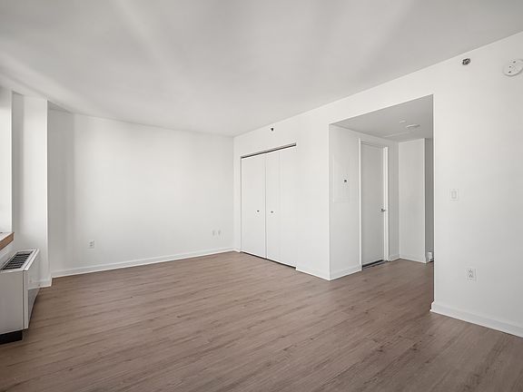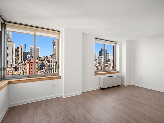 The building features a 24-hour concierge, a roof terrace, a roof deck, a communal workspace, a gym, and a laundry room. Located steps from the PATH Train, the 34th St Subway, Macy's, Penn Station, and Herald Square.