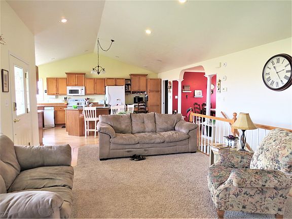 Newer 5 bedroom home that sits on 5 acres right on the northern edge of town! Built by Greg Stubbs, features an open floor plan with high vaulted ceilings, large kitchen with island, built-in desk, formal dining room with arched doorway, master suite with HUGE bathroom, dual head tile shower & walk-in closet, convenient main floor laundry/mud room with storage lockers. Over sized two car garage with attached kennel with doggy door for easy in and out access. Nice shelter belt bordering west of property. Finished basement with large family/rec areas and three bedrooms plus large bath. Property is on a shared well AND 1500 gallon cistern. Great place to raise chickens, goats, pigs, horses etc.