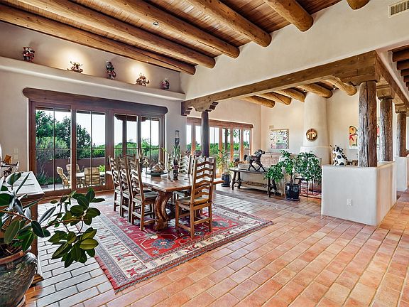 Experience Timeless Santa Fe Elegance in Las Campanas. Approach this exceptional Las Campanas residence through a walled courtyard shaded by mature aspens and graced with fruit trees. Step through the grand rustic wood double doors into a spacious, light-filled central living area that seamlessly unites the living room, dining space, gourmet kitchen, and breakfast nook. The home’s layout offers perfect privacy: the primary suite and office are thoughtfully situated in one wing, while two guest suites occupy the opposite side. Throughout, traditional Santa Fe craftsmanship shines—diamond plaster walls, vigas, carved corbels, and built-in shelving and nichos that invite you to showcase art and treasured objects. The living room centers around a large kiva fireplace and frames views of the Jemez Mountains. Glass doors open to an expansive portale, ideal for entertaining or simply savoring the views. The gourmet kitchen features a six-burner Wolf range, wine cooler, granite countertops, center island, and connects to a charming breakfast nook with its own kiva fireplace. The primary suite is a serene retreat with a kiva fireplace, two large walk-in California Closets with built-in storage, and a luxurious bathroom featuring a bidet toilet, steam shower, and jetted tub. Step directly from the suite onto a private portale for morning coffee or evening stargazing. A spacious office with a built-in double desk completes this private wing. Each guest suite offers an en-suite bathroom, and access to a shaded portale; one bathroom includes a double vanity and jetted tub. Outdoor living is enhanced by large, shaded portales with high viga ceilings. The main portale features a built-in gas grill and automated shades. Mature aspens, fruit trees, and lush landscaping create a peaceful, private sanctuary. This home blends the soul of traditional Santa Fe design with the comfort and functionality of modern luxury—all in the heart of Las Campanas.
