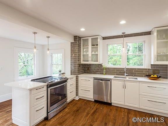 Classic meets modern in this newly remodeled historic charm. Conveniently located in the heart of West Asheville, this beautiful home offers an open kitchen, fireplace, bright sunroom, refinished hardwood floors throughout and a large deck perfect for entertaining. Lovely landscape, large workshop, additional basement space, private driveway and off street parking. Click on the Virtual Tour...