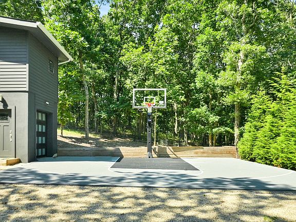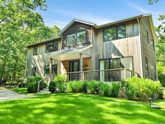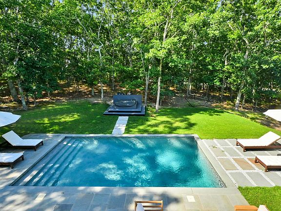 The 5,700 square-foot stylish and cozy interior is full of natural light and bright living spaces. As you drive up to the house, you will notice the sizable front porch, an ideal place to bask in the crisp Hamptons air. Relax in the cheerful living room surrounded by windows and sliding glass doors in front of the gas fireplace. Whip up a hearty brunch in the chef's kitchen with a Wolf wine fridge, top-of-the-line stainless steel appliances, and a sizable quartz island. On the island with three chairs, sip a fresh cup of home-brewed coffee or cappuccino with the morning paper. Share a meal at the chic six-person dining table overlooking the backyard. Play pleasant music in the background, inside and outside, using the Sonos speaker system. Congregate in the den areas with plush furniture and flat-screen TVs. The private, scenic backyard with bluestone patios is ideal for entertaining and unwinding with friends and family. Fire up meat and veggies on the gas grill to enjoy al fresco on the comfortable patio furniture, including a table and plush couches. Soak up the sun with a cool drink poolside from the four lounge chairs. Take a refreshing dip and float around the heated, freshwater gunite pool. On cooler nights, decompress in the hot tub and tell stories around the gas fire pit. Work up a sweat in the fitness room containing a treadmill, Tonal system or weight training equipment or on the home's basketball court before hitting the infrared sauna. Afterward, use the outdoor shower with hot and cold water. The sleek, custom-designed 900-square-foot pool house provides additional living and entertaining space with a TV and full bathroom. When you're ready to explore, you are minutes from restaurants, shops, and activities for the whole family in Watermill, Bridgehampton, and Sag Harbor. At the end of a sun-soaked day, get a good night's sleep in the four spacious bedrooms, each with a full ensuite bathroom. The primary suite features a gas fireplace and a balcony, ideal for sipping your morning coffee or enjoying a nightcap before sleep. Water Mill Wooded Escape is an unforgettable Hamptons retreat.