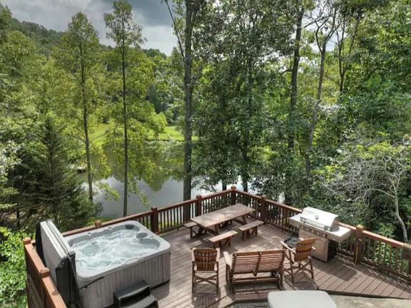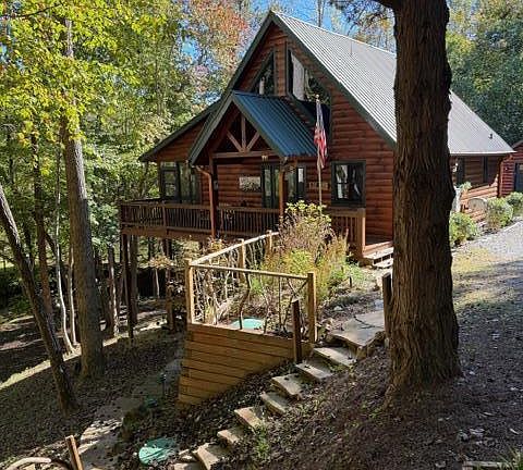 Welcome to 706 Magnolia Way . A cedar contemporary split level home in the wooded established neighborhood of Bramble Oak . The home is nestled in a wooded lot in a private cul-de-sac . There is a stream at the edge of property thru the woods. Enjoy the established trees and mature plants. We've cultivated the yard and half of the c Reduced $15,000! Motivated sellers may contribute toward a one year interest rate buy-down with an accepted offer. Seller's preferred lender required for incentive. A one-year AHS home warranty is also included for peace of mind. Discover your perfect Blue Ridge getaway in this beautifully maintained 3BR + bonus room (used as 4th BR) / 3BA log home, just 10 minutes from downtown. Set on 1.55 acres with 385 feet of rushing creek frontage (Mitchell Branch), this property combines natural beauty, privacy, and modern comfort—a rare find at this price. Enjoy mornings on the screened porch overlooking the creek and serene pond views, then unwind under the new outdoor pavilion by the stone fireplace. The 2-car detached garage and extensive outdoor spaces make this the ideal year-round mountain retreat plus....extra large 2-car garage with high pitched ceiling and lots of attic space 1/2 acre across the road that is part of the property with built in hiking steps into the woods Step inside to a warm, inviting interior featuring rich wood finishes, vaulted ceilings, and a cozy stone fireplace. The open-concept layout blends rustic charm with modern comfort. New furnishings throughout bring a fresh, stylish touch while honoring the cabin's authentic mountain character. Recent upgrades include a reinforced wall and deck with a hot tub, beautiful newly built natural wood pavilion with a lovely stone wood burning fireplace , new appliances and sink, and a whole-home water filtration system. Offered fully furnished with a strong rental history, this home is truly turnkey—ready for personal enjoyment or as an excellent investment opportunity.