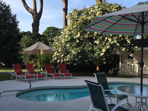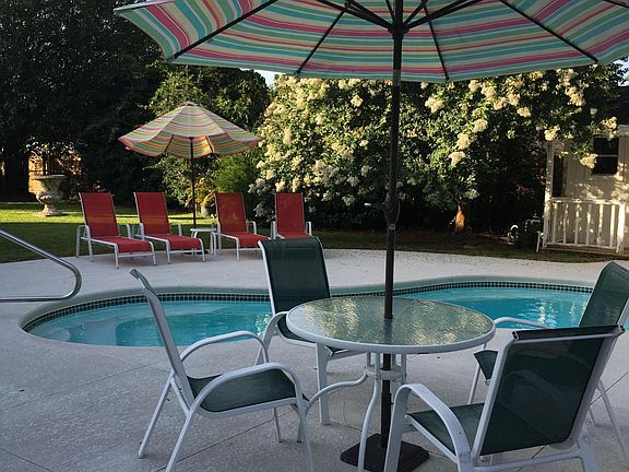 Lovely updated brick home on tree-lined lot with mature landscaping. Spacious open floor plan, hardwood floors, large eat-in kitchen with granite counters and stainless appliances. Family Room with fireplace and built-in shelving, flexible living and dining/office area. Three bedrooms and baths, tiled laundry and sunroom. Large fenced backyard with expansive patio, saltwater pool and storage room with power and lights, Two car garage complete this property.