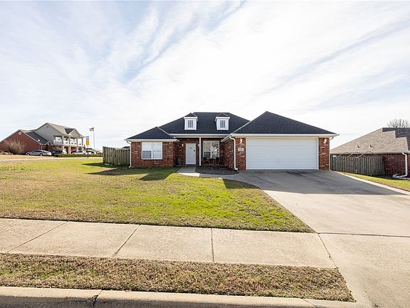 Set on a large corner lot with a privacy-fenced backyard, this all-brick home features a covered front porch and a split floor plan that keeps the layout feeling open and comfortable. Inside, the living area includes vinyl flooring, tray ceiling, and a gas fireplace. Kitchen features granite counters, eat-in dining and opens to the living room for an easy, everyday flow. Primary suite offers a tray ceiling and bath with large tub, walk-in shower, and walk-in closet, while two additional bedrooms share a full bath, giving the home flexibility for a variety of living needs or investment potential. A newer roof adds peace of mind, the washer, dryer, and refrigerator convey with an acceptable offer, and the location provides everyday convenience with quick access to shopping, dining, and major NWA corridors—just 15 minutes to the Walmart Home Office and an easy route to Bentonville. Neighborhood amenities include a clubhouse, pool, playground, and nearby trails, offering several options for recreation and convenience.