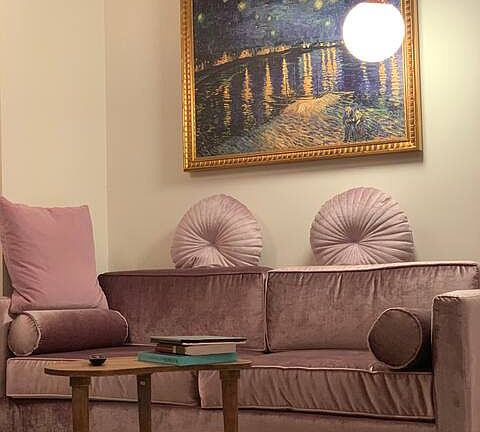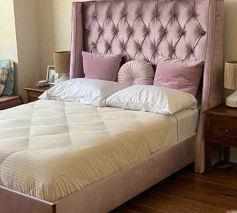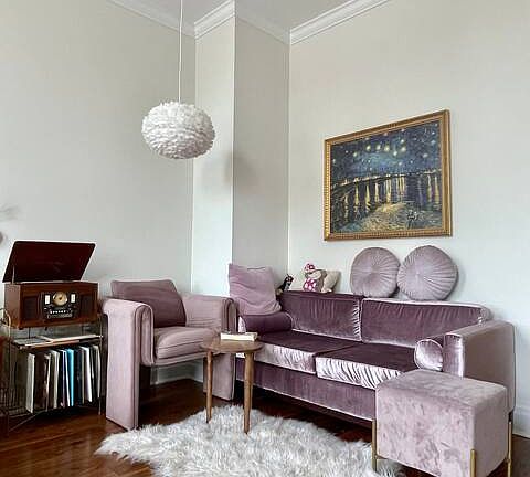 Homy atmosphere and sleek transitional design: Hollywood glam style bathroom, velvet bed & sofa, retro giant working/gallery space, a comfy day bed, just to name a few gems.