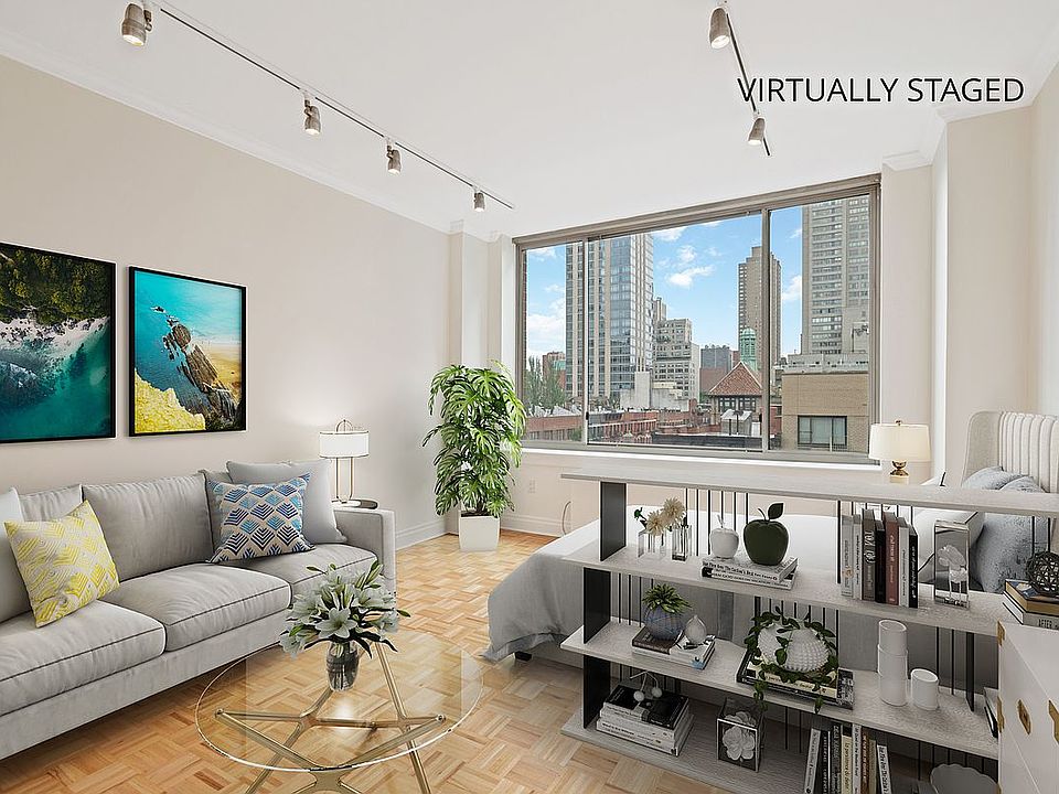 Welcome home to this large, loft-like studio with 10.5 ft ceilings, wood parquet floors and sunny Eastern exposure with lovely open city and sky-line views. Gorgeous custom built-ins through-out offering tons of storage.This space has been newly painted and is move in ready.