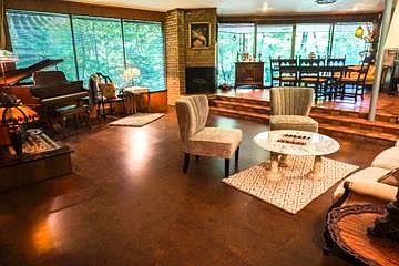 SERENITY & NATURE - STRIKING MID-CENTURY Architectural Details - 2 Wooded Parcels+Babbling Stream. Custom Quality 1 Story 1stFlr Owneruite/3 BA +Lower Level Entry SUITE/APT, 4th BR/Den, 2nd Ktchn, 2Car. EXPANSIVE Sunny Views, LG Open Great Rm-Dining Rm, Stone Fireplace, Butler Door Ktchn, Some Hdwd Flrs. Rich Wood Doors-Wdwk-Built-ins, New Carpet Rec Rm+LL 4th BR/Den. New Roof 2017, BRICK+Redwood Siding, Porch-Deck-Patio, Organic Landscape. Inspired by FRANK LLOYD WRIGHT.