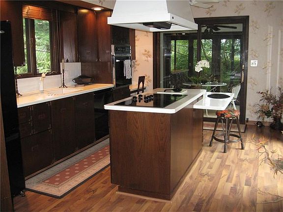 Contemporary in the woods! Private yet convenient, open and airy with large windows, top quality throughout, kitchen with island opens to screened in porch, wrap around deck, very large open floor plan great for entertaining, bedrooms feature large closets and great views, finished walkout lower level with beautiful log burning fireplace, moveable bar and kitchen. Must see interior.
