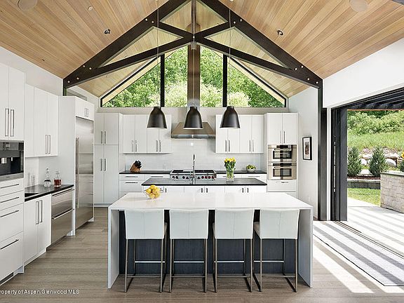 Recently completed, contemporary Sinclair Meadows home in Snowmass Village. Located at the end of the cul-de-sac on Gambel Way the Studio One designed home backs up to a beautiful grove of Aspen trees and makes an architectural statement from all angles. The abundant 900 square feet of deck boasts dramatic Northwest views of Wildcat Ridge. The home's interior design and strategic flow represents an excruciating attention to detail and maximizes every square inch effortlessly blending form and function. Hardwood white oak floors imported from Europe, vertical grain hemlock ceiling, Italian Porcelain and Colorado Limestone, Vantage Lighting, Sonos sound system indoor and out, central air conditioning, Nest system, Hunter Douglas motorized shades and custom cabinetry throughout.