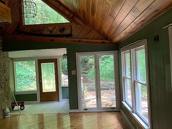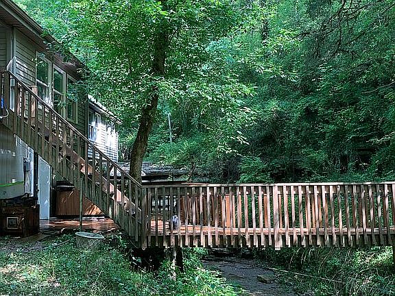 Amazing location, idyllic view, your own private creek running straight to your private view and access to the Kentucky river. Accessible from the end of Hidden Grove, across your own private walking bridge, and from the end of lower Amster Grove Court with a large concrete parking area. Decks for outside living and windows galore, with all the privacy needed to enjoy them. Inside the covered front porch, you will find the living area with Australian Cypress hardwood, covered in natural light from multiple windows in the high wood ceilings, enhanced by a creek rock wall. At the rear is a large eat in kitchen, with large pantry, ceramic tile, stainless appliances, and a beautiful view of the creek. A large bedroom with original rock fireplace, and full tiled bathroom complete the main floor. Upstairs is the master suite loft, with an extra large bedroom, huge walk-in closet with washer/dryer hookup, and a bathroom with pedestal sink and walk-in shower. Downstairs you will find the unique creek bathroom with a jetted tub and large closet. The large bedroom, accented by the rock wall and walnut trim, has a walk-in closet and exterior access to the lower deck overlooking the creek. This scenic Kentucky river home features an extra large deck overlooking the river, providing space for a river front party, or an intimate gathering around the Bedford stone fire ring. Direct waterfront access for fishing, kayaking/canoeing, boating or your own private dock.