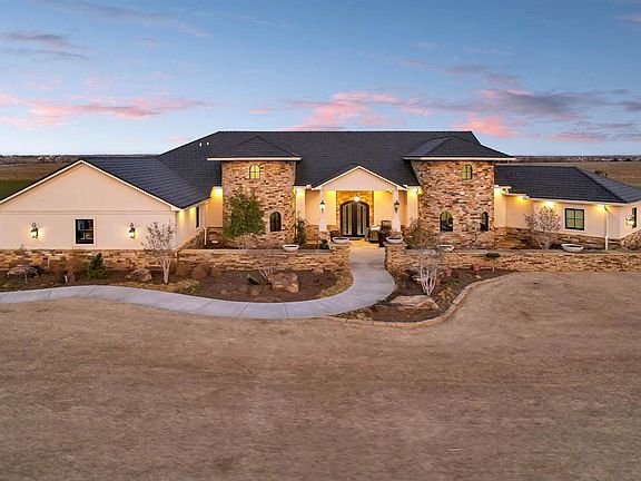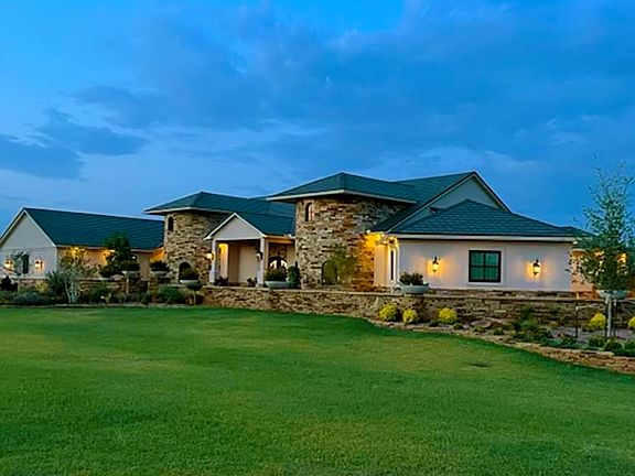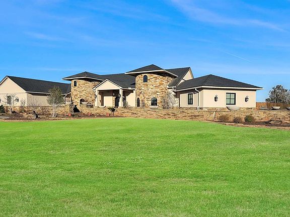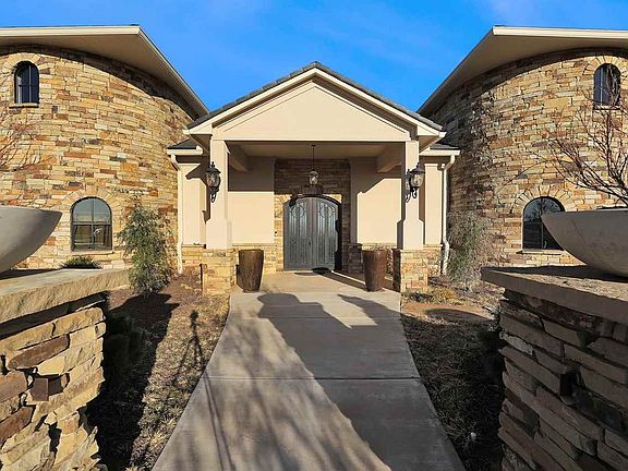 This is a one of a kind home in a wonderful setting where no expense was spared. The property features a top quality, ultra-distinctive homestead that serves as the crown jewel for discerning buyers seeking wonderful accommodations, awesome views and a thoughtfully planned and executed outbuilding with an additional living space. The residence is the only Scottsdale/Santa Barbara style home anywhere in this part of the country. The plans for this “Villa Incantato” were designed by an architect in Scottsdale, AZ. So you have one chance in a lifetime to have a home with this unique and high quality design. The site has two acres with the option of purchasing a third. The entrance is set off by a stone half wall that runs the length of the home with decorative planters which encloses beautiful landscaping as you walk up to a hand-crafted double wrought iron door flanked by two striking brick rounded turrets. As you walk in, you’re greeted with style around every corner. It’s an open floor plan with the main great room opening into a chef’s dream kitchen. The centerpiece is a granite island that is to die for. The granite surfaced is leathered and has a tiered bar. There are double Wolf ovens along with a commercial grade Wolf gas cooktop with griddle with pot filler and Commercial vent hood overhead The double sided Subzero refrigerator is one of the largest they make There’s also a Wolf microwave, Scottsman icemaker and KitchenAid Suites Collection dishwasher. In addition there’s storage galore with a closet sized pantry and three levels of cabinetry. The kitchen design is accented with a cross beamed ceiling. From the entrance to the home you look straight east and can see right through the glass doorways out to the covered patio and the pool. The focal point of the great room is a two side linear gas fireplace that can heat nearly half the home with hand crafted built-ins on either side. The formal dining room located in the south turret features so many beautiful accents including crown molding, hand crafted wainscoting and a butler’s cabinet featuring sliding barn like style cabinet doors with a granite top. The other turret houses a small office and storage area with a ½ bath off it. The spacious primary bedroom has double doors that lead out to the covered patio and three large windows looking east towards the pool. The ensuite primary bedroom bath features double vanities, each at different heights. The walk-in tiled shower has both rain head and twin standard shower heads. But this bath features just a couple of the many luxuries you’ll find throughout this home. The beautiful Bain Ultra jetted soaker tub has an air drying feature plus adjustable settings for heat. The Neorest commode features heated seating and sensored automatic lift on its cover. The walk-in closet is the size of a bedroom and features a dressing table, sitting areas, shoe shelving, and pull down racks for extra clothes storage. Off the closet is a 600 SF craft or art room with wall to wall built-ins and pop up USB/electrical ports throughout. There’s also a separate laundry room (two different laundry rooms on each side of the house) with lots of storage, sink, and room to hang clothes. Northeast off the kitchen is a 1200 SF workout room with seven giant picture windows and room for a couple of tvs. The workout room is the only carpeted room in the house. The rest of the house has custom ceramic tile. The other 3 bedrooms take up another residence wing of the house which includes a TV or study room as well. All 3 bedrooms have baths with full tiled showers in them. Off the house is an 1170 SF attached 3 car+ garage complete with granite dog washing station. There is a safe room off the garage that is heat & cooled. Out back there is a huge covered patio with four ceiling fans looking east out over the pool area and its own heat and air conditioning unit plus an outdoor tv and half bath. You really must see it to believe it!