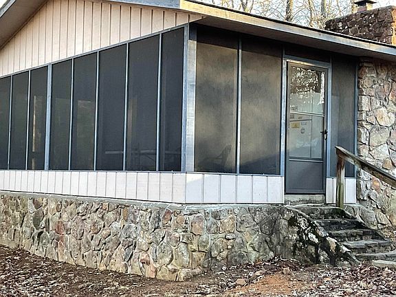 across the street from the lake home less than a mile from boat launching at Cherokee Park Rec Area, You will love the screened in porch across the front with great wooded views. You also have wooded areas on the left side and rear of home. Home offers a huge stone fireplace with insert, vaulted ceiling den, many many kit. cabinets, dining area open to kitchen & den, all new kitchen appliances, washer/dryer/fridge remain, great front viewing windows. 2 BR's/1 & 1/2 baths, basement area that makes a great storm cellar or add a mini split for sleeping extra people (very dry, clean & no basement odor). 20x25 carport with closet, portable boat coverage, 12x16 shop/shed. Corner lot & mostly wooded. Comfortable, Convenient, Clean.