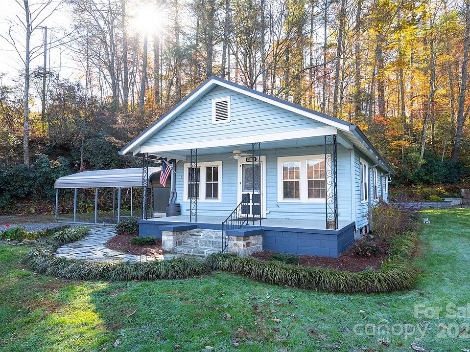 This delightful, unfurnished Craftsman-style cottage offers a perfect blend of charm and convenience just off Crab Creek Road. The single-story home, located at 350 Island Cove Rd, features 2 bedrooms and 1 bathroom and sits on a level 0.44-acre lot. Inside, the home exudes a refined, classic feel with painted wood ceilings, custom built-in shelving, durable wood doors, and original brass doorknobs. Overlooking a portion of the Little River Valley and offering some short-range mountain views, the location is ideal for appreciating the natural beauty of the area. Outdoor living is a breeze with a dedicated garden area and a nice outside grill area for entertaining, while the covered front porch is perfect for soaking in the views, and the back porch offers great privacy. This property is a nature lover's dream, located just minutes from multiple trailheads into DuPont State Forest, and is a short, scenic drive to the cultural attractions of two beloved mountain towns: Brevard, known for its waterfalls, cycling, and music center, and Hendersonville, featuring a historic downtown with diverse dining, local galleries, and seasonal activities. There are no restrictions.