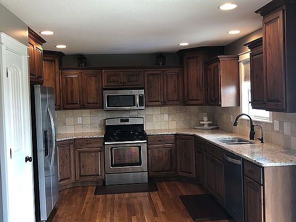Sharp well maintained large corner lot home in Shadow Ridge with walking distance to middle school and perfect central location between Lawrence and KC. This beautiful home features hardwood floors, stainless steel appliances with a gas stove, granite and onyx countertops on alder stained cabinetry, lazy susans, large walk-in tiled shower in master, 2 living areas, lots of natural light, water filtration/softener system, and an OVERSIZED garage.