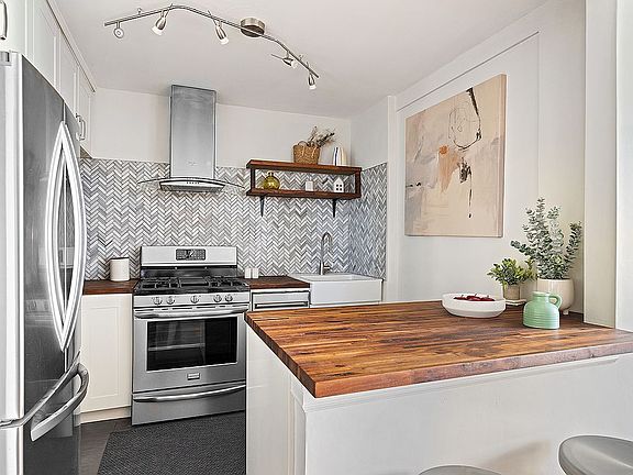 This quiet apartment opens into a giant living room with tree views and great light. The kitchen has been fully renovated with an open layout that's perfect for hanging out or whipping up your favorite meals. Tons of cabinets and drawers mean you'll have all the storage space you need, and that giant butcher block countertop. Perfect for all your chopping and prepping while you cook. Plus, the shiny new stainless steel appliances are ready to handle whatever culinary adventures you throw their way. The five burner stove has a vented hood and the LG fridge has convenient double doors.