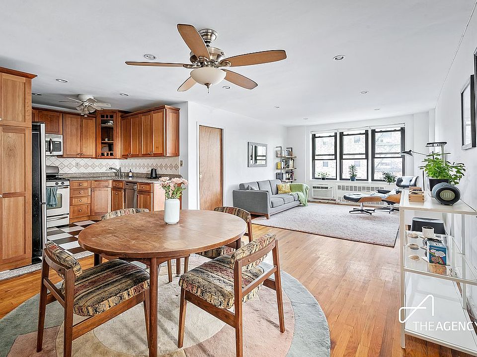 Unit 4M features a generous living room and dining room area, hardwood floors, renovated bathroom and kitchen, along with 5 very large closets. Originally a one bedroom and currently configured as a two bedroom, the primary bedroom can easily fit a King-sized bed and more, with the second room being a perfect option for a den or home office.