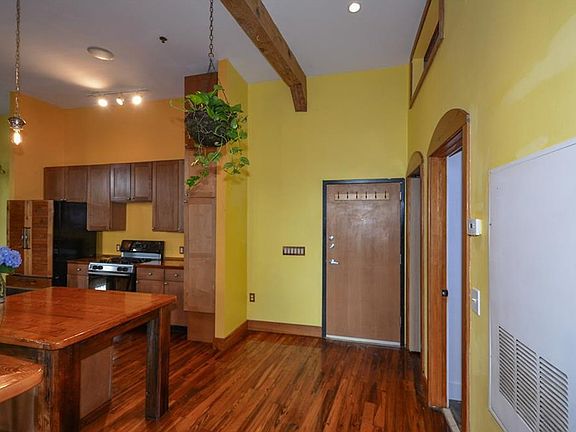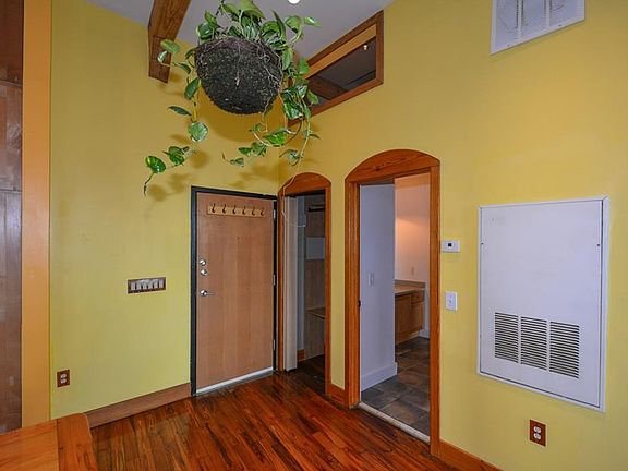 Unique 1 bedroom 1 bath unit plus large additional sleeping loft. Light open floorplan with 20 foot ceilings and huge windows. Custom kitchen with wood counters/bar area and custom molding throughout. End unit with one of only 2 patios in the building. Upgraded insulated windows, fireplace with "technology center" housing sound system and hub for all electronics. Speakers and recessed lighting throughout unit including upstairs loft area. Two closets, large bath with separate tub and shower. Custom shelving and detail throughout the unit. Many special upgrades.