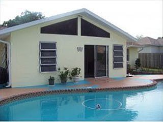 Charming 3 bedroom, 2 bathroom POOL home with an expansive, fully fenced-in backyard. This home offers a spacious and functional layout with split bedrooms and a huge sun room featuring French doors and vaulted ceilings. Sliding doors lead out to the backyard oasis where you'll find an oversized patio and sparkling, in-ground pool. Interior laundry room with large basin sink just off the 2 car garage. Newer roof and A/C. Home includes hurricane shutters.
