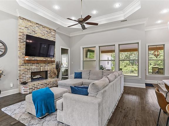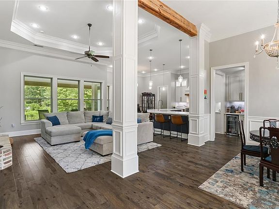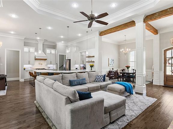 Stunning 5 bed/3 bath home located in desirable Black River Forest subdivision. Open floor plan with beautiful hardwood floors throughout, 12 ft ceilings, fireplace, exposed cedar beams in living area and beautiful moldings and millwork. Gorgeous gourmet kitchen remodel with oversized quartz kitchen island, stainless steel appliances, custom vent hood and 36 inch six-burner gas stove. The kitchen also features a large walk-in pantry and butler's pantry with wine cooler. Huge primary bedroom with ensuite bath and custom closets. Side door entrance, mud room, plantation shutters and large 5th bedroom/media room located on the 2nd floor are an added bonus. Attached two car garage and long driveway with parking for multiple cars. The home is located on an oversized lot that backs up to a creek. The backyard is a peaceful oasis with an extended, covered patio perfect for entertaining and beautiful, unobstructed views. Low flood insurance and assumable policy in place. Must see!