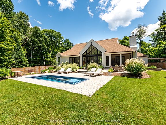 This exceptional high-end bungalow blends the charm of a European villa with modern luxury. Set well back from the road and approached by a circular driveway, the home boasts a striking exterior with wood siding, vertical board and batten, painted brick accents, and arched doorways. Inside, the kitchen is a masterclass in design, featuring an oversized island with a prep sink, panel-front appliances, and a stunning Elise propane range with pot filler. A walk-in pantry offers seamless storage. Vaulted ceilings in the kitchen and living room enhance the sense of space, while a propane stone fireplace anchors the open-concept design. A full wall of windows opens to an exquisite outdoor living area: a custom hexagonal stone patio surrounding a beautiful pool and mostly level, fully fenced backyard. The screened Muskoka Room with a wood-burning fireplace provides an inviting retreat, while the adjacent dining room is ideal for entertaining. The private bedroom wing includes two spacious guest bedrooms sharing a 5-piece Jack and Jill bathroom, and the rear-positioned primary suite offers serene backyard views. Its spa-like ensuite features a freestanding tub, glass-enclosed shower, and double vanity, while the walk-in dressing room provides ample storage. The opposite wing includes a large laundry room with folding surface, drying rack, and stylish laundry sink, as well as a mudroom with built-in storage and access to the heated double garage, currently a workshop but easily converted. The lower level offers a generous rec room, two additional bedrooms, and a 3-piece bathroom. A whimsical playhouse under the stairs adds charm, while a spacious storage room and tidy utility area complete the space. A rare find crafted with impeccable design, this home is a perfect blend of style and functionality.