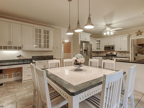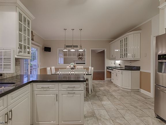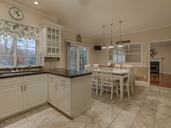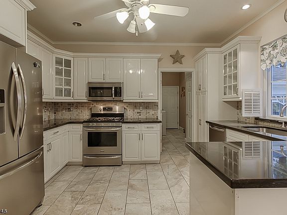 Walk into this remarkably kept home!!! 9 foot ceilings first fl. Newer bright spacious kitchen with sliding glass doors to deck and patio with gazebo. Open area with living and family room hardwood floors, custom tray ceiling and moldings. custom bar with wine rack and floor to ceiling glass rack. Gas fireplace with marble insert. 9 foot ceilings. Second floor has a master bedroom suite consisting of 2 rooms and master bath with separate shower and tub. Also has 3 additional bedrooms and a den which does have a closet. Lastly a finished basement with half bath and custom dry bar, Tile floor . Berber carpeting in rec room area. additional play room or office area. Plenty of storage. This home has it all.